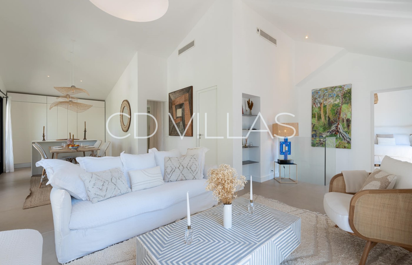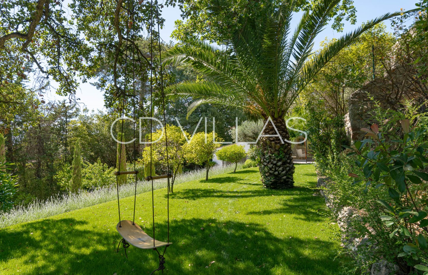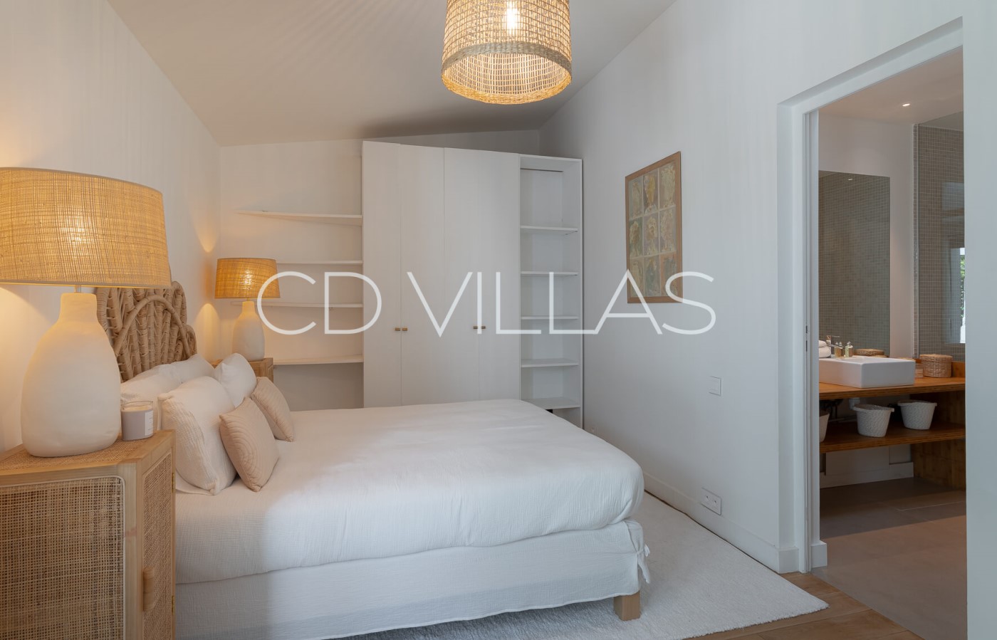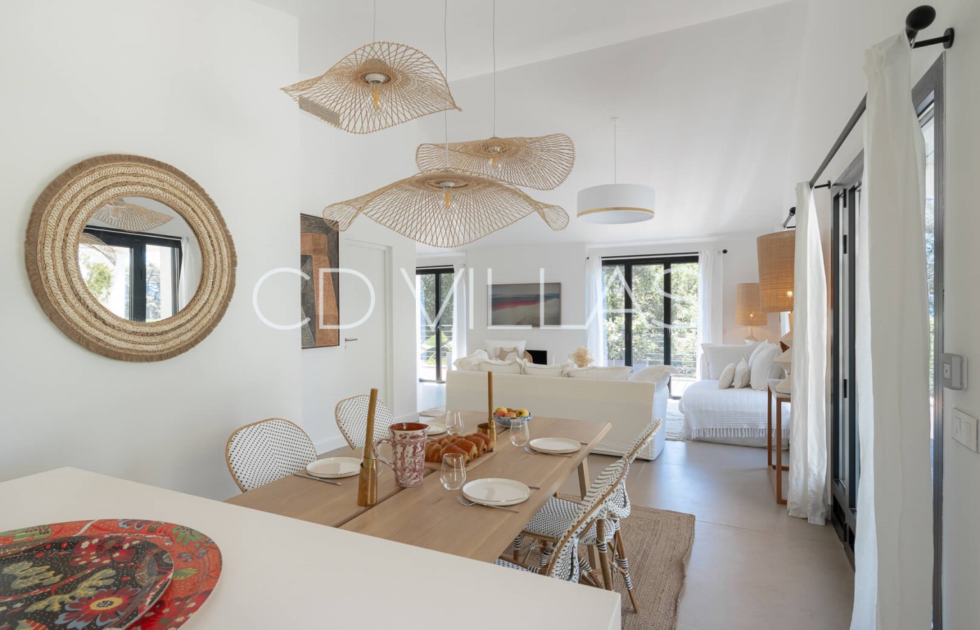 This beautiful property offers newly refurbished high end interiors with 3 bedrooms and 3 bathrooms and is fully air conditioned. The interiors are distributed over 2 floors with living, kitchen and dining on the ground floor, the en suite Master bedroom and bedroom 2 are located on the same floor. Steps lead down to the third bedroom with bathroom on the garden level. The living areas benefit from plenty of natural light and have access to an outdoor terrace with views. Outside the idyllic gardens with beautifully kept lawn and Mediterranean vegetation invite to relax in nature, a saltwater swimming pool which measures about 6 x 3 meters is available for guests. All outdoor living areas are quiet and private with no vis a vis.