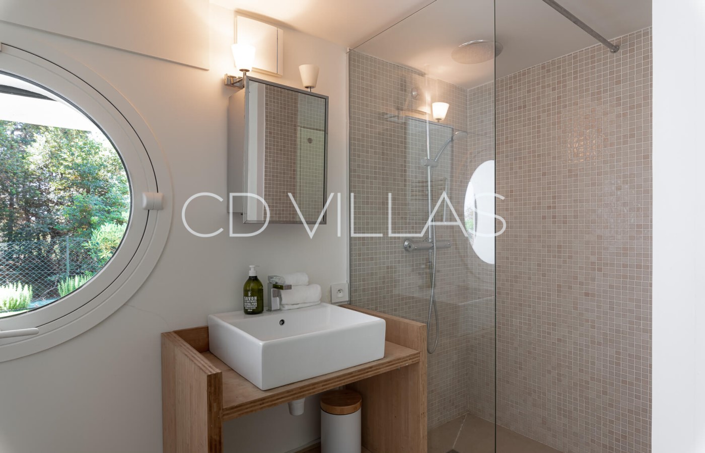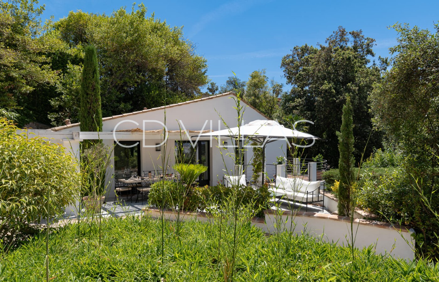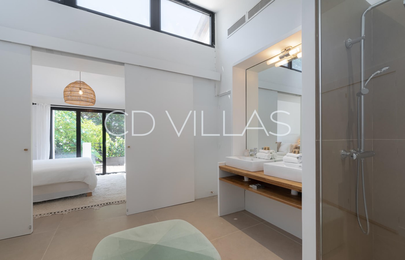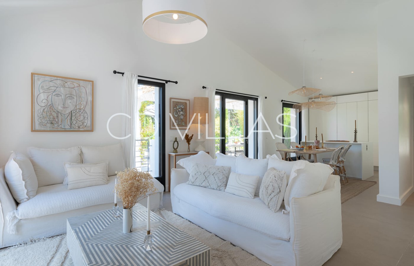 This beautiful property offers newly refurbished high end interiors with 3 bedrooms and 3 bathrooms and is fully air conditioned. The interiors are distributed over 2 floors with living, kitchen and dining on the ground floor, the en suite Master bedroom and bedroom 2 are located on the same floor. Steps lead down to the third bedroom with bathroom on the garden level. The living areas benefit from plenty of natural light and have access to an outdoor terrace with views. Outside the idyllic gardens with beautifully kept lawn and Mediterranean vegetation invite to relax in nature, a saltwater swimming pool which measures about 6 x 3 meters is available for guests. All outdoor living areas are quiet and private with no vis a vis.