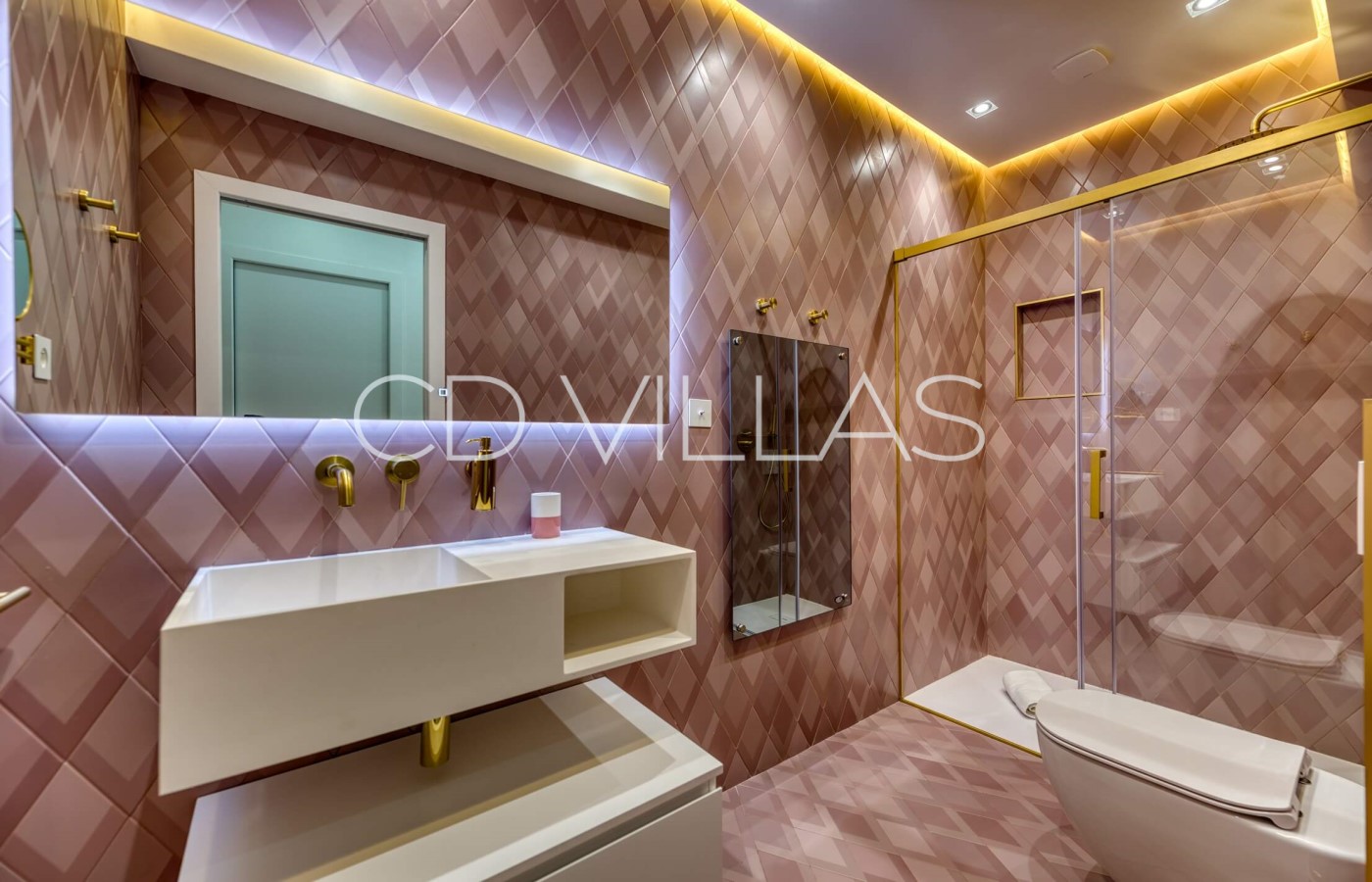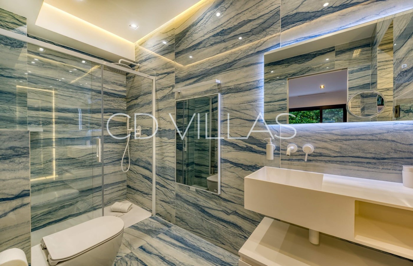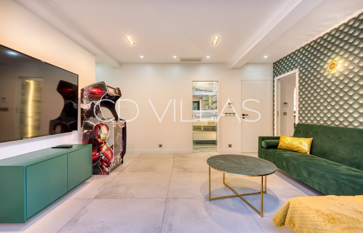 The ground floor of the main house offers a large open space with a well-equipped kitchen, a spacious dining room with panoramic windows and a living room with elegant velvet sofas, fireplace and a grand piano. The master bedroom and another smaller bedroom are also located on this floor. The lower floor houses another living/games room and 3 bedrooms with their own bathrooms.