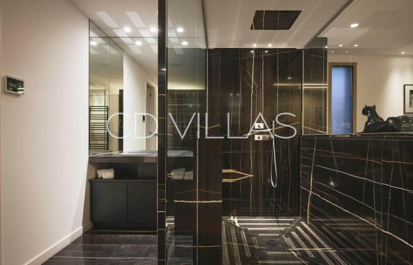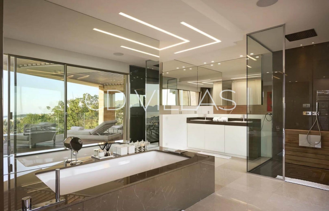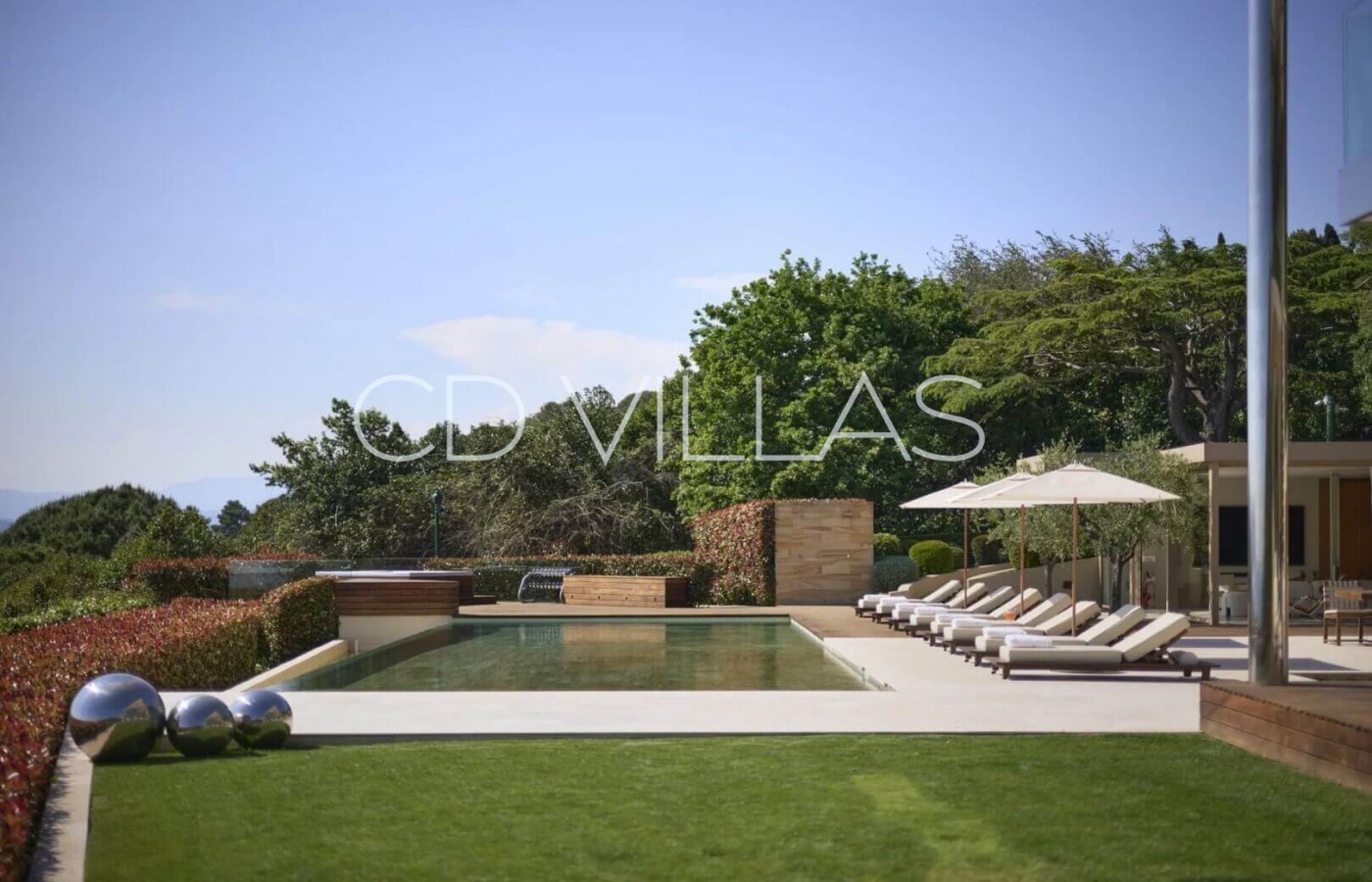 The villa's outdoor spaces are dedicated to relaxation and entertainment, offering a true private resort atmosphere. Guests can unwind by the heated swimming pool, relax in the jacuzzi, or rejuvenate in the hammam. The property also features an outdoor fitness area, a padel court, elegant terraces, and a stylish pool house designed for long Mediterranean days and evenings.
