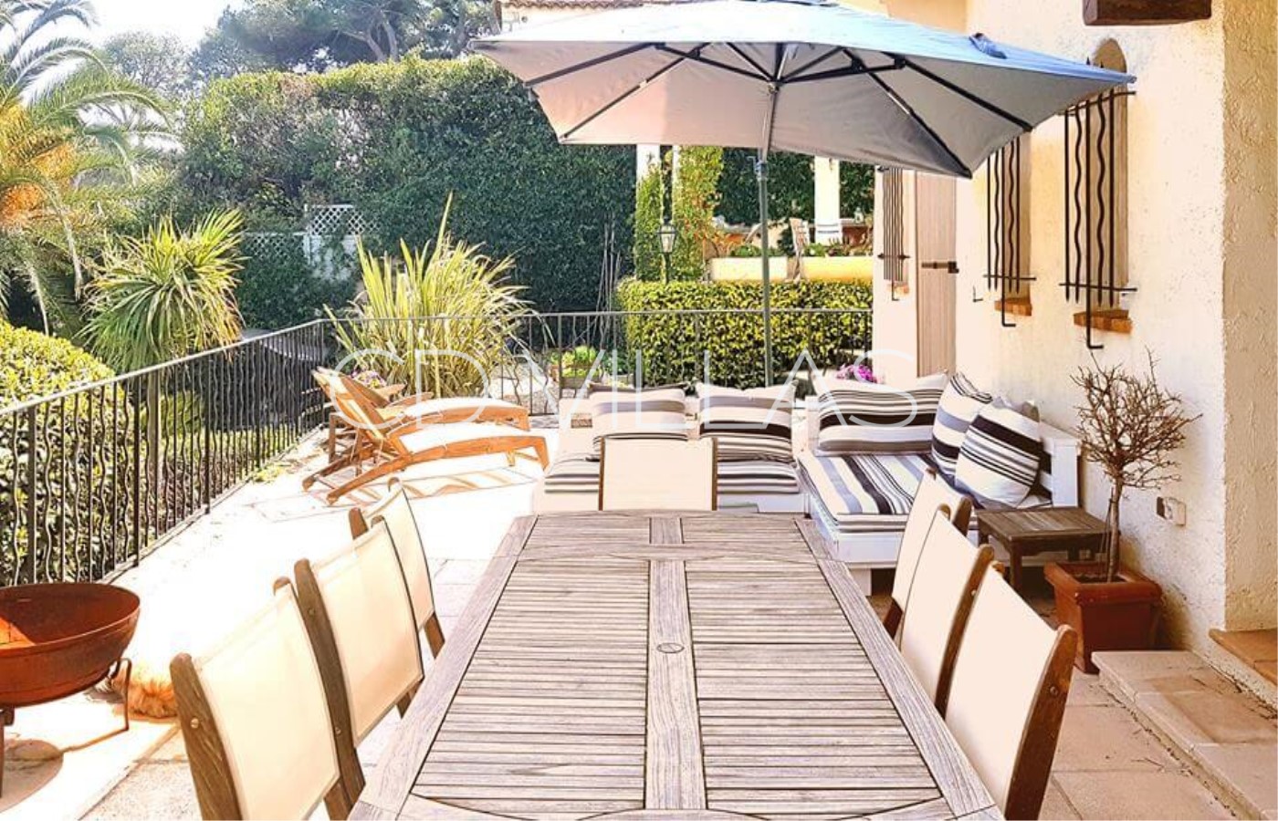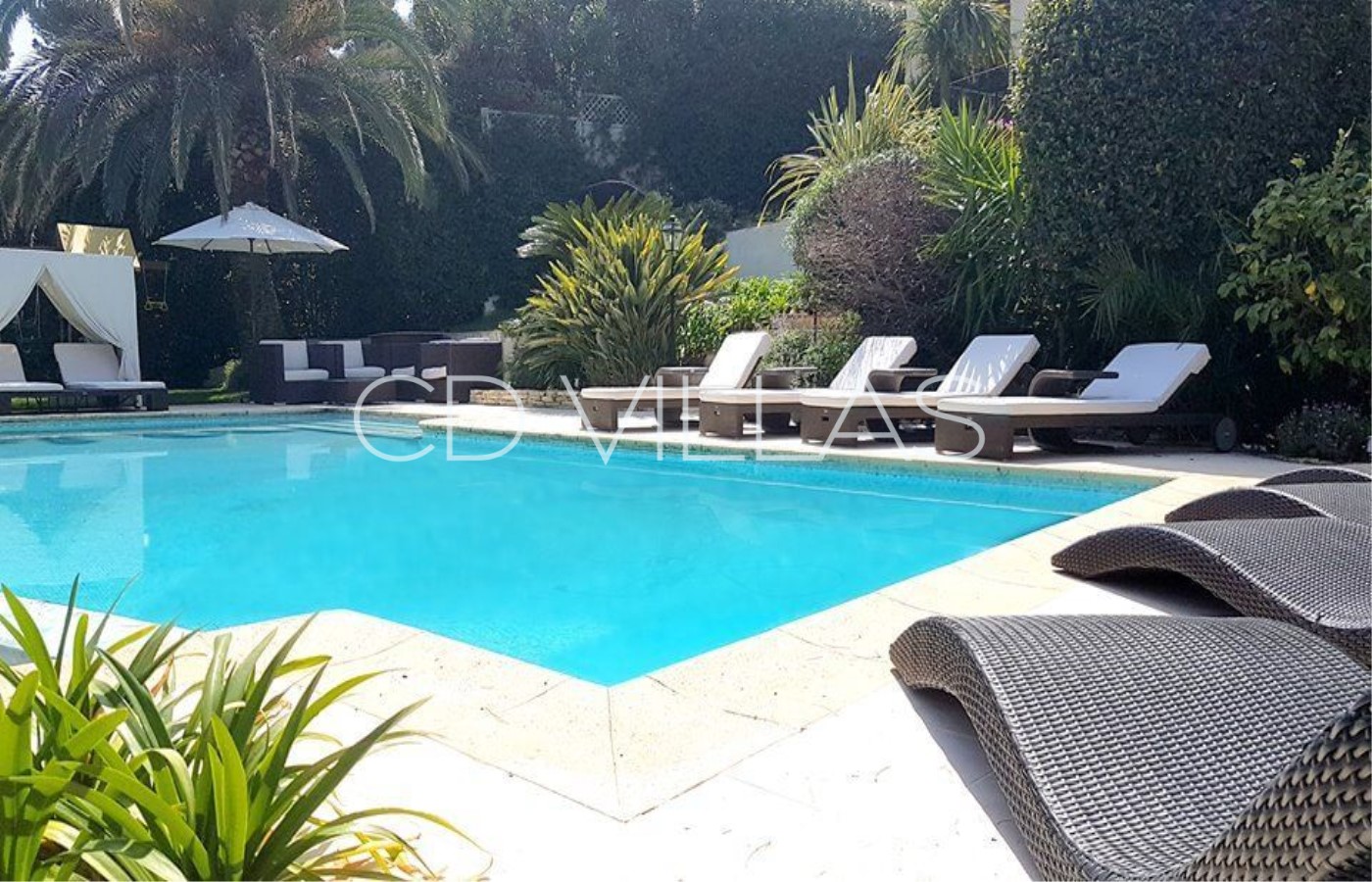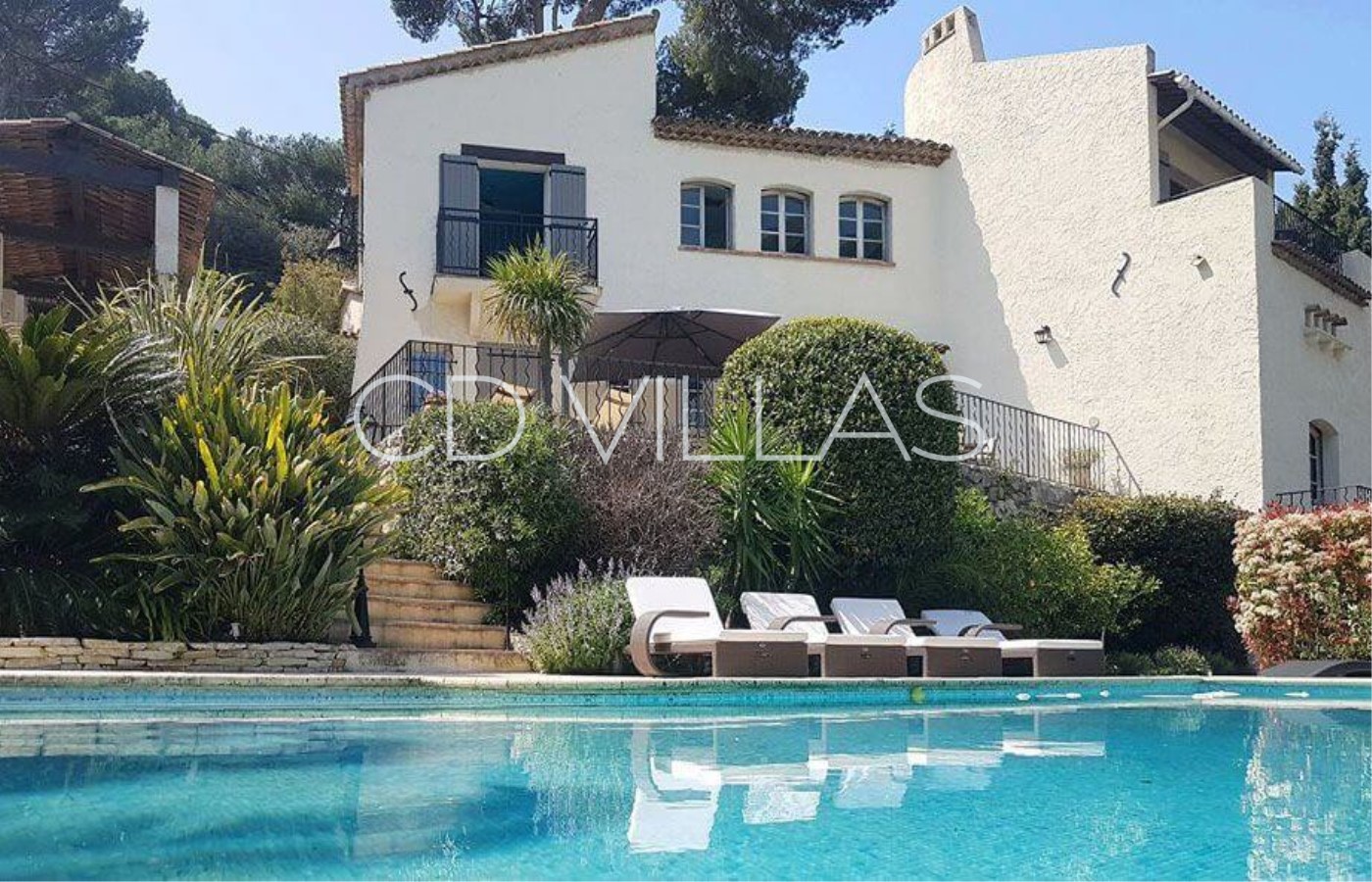 The property sits in a pretty garden, surrounded by umbrella pines and palm trees with a large infinity pool that can be heated.