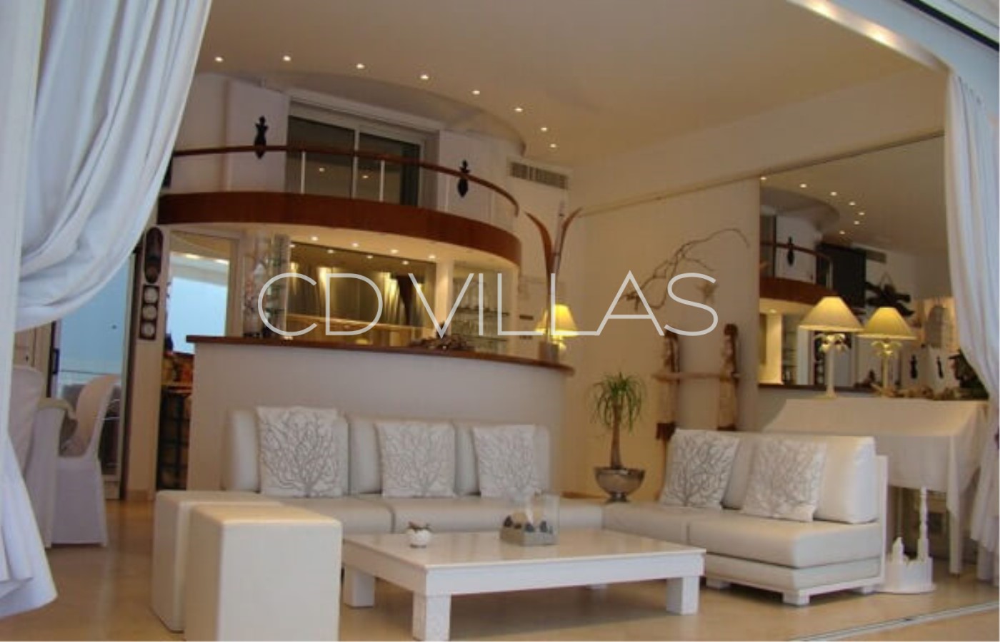 Living Room - Beautiful open plan South facing living and dining area, decorated with carefully selected modern furniture, white and neutral shades. With wall to ceiling sliding doors, the living opens onto a large terrace overlooking the sea