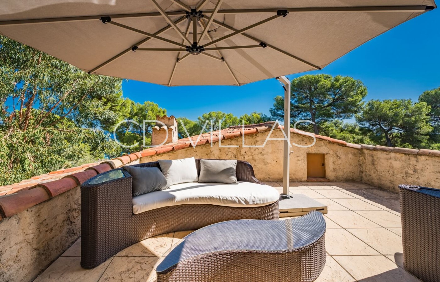 Steps lead up to the first floor with a second Master bedroom with en suite bathroom and private terrace with views out to sea. There is a another light flooded bedroom with queen sized bed on this floor, also with en suite shower room.
