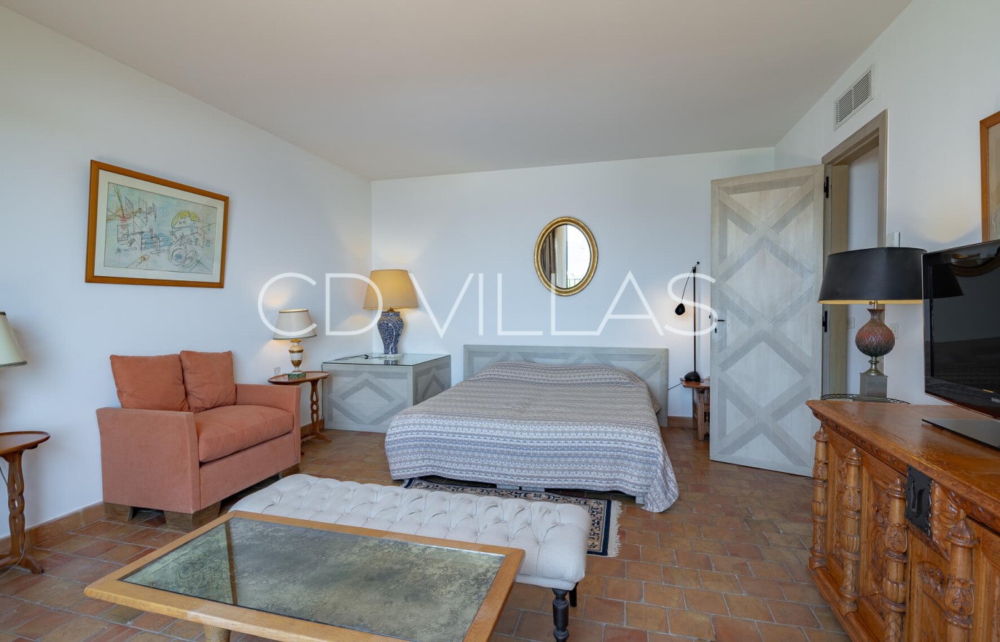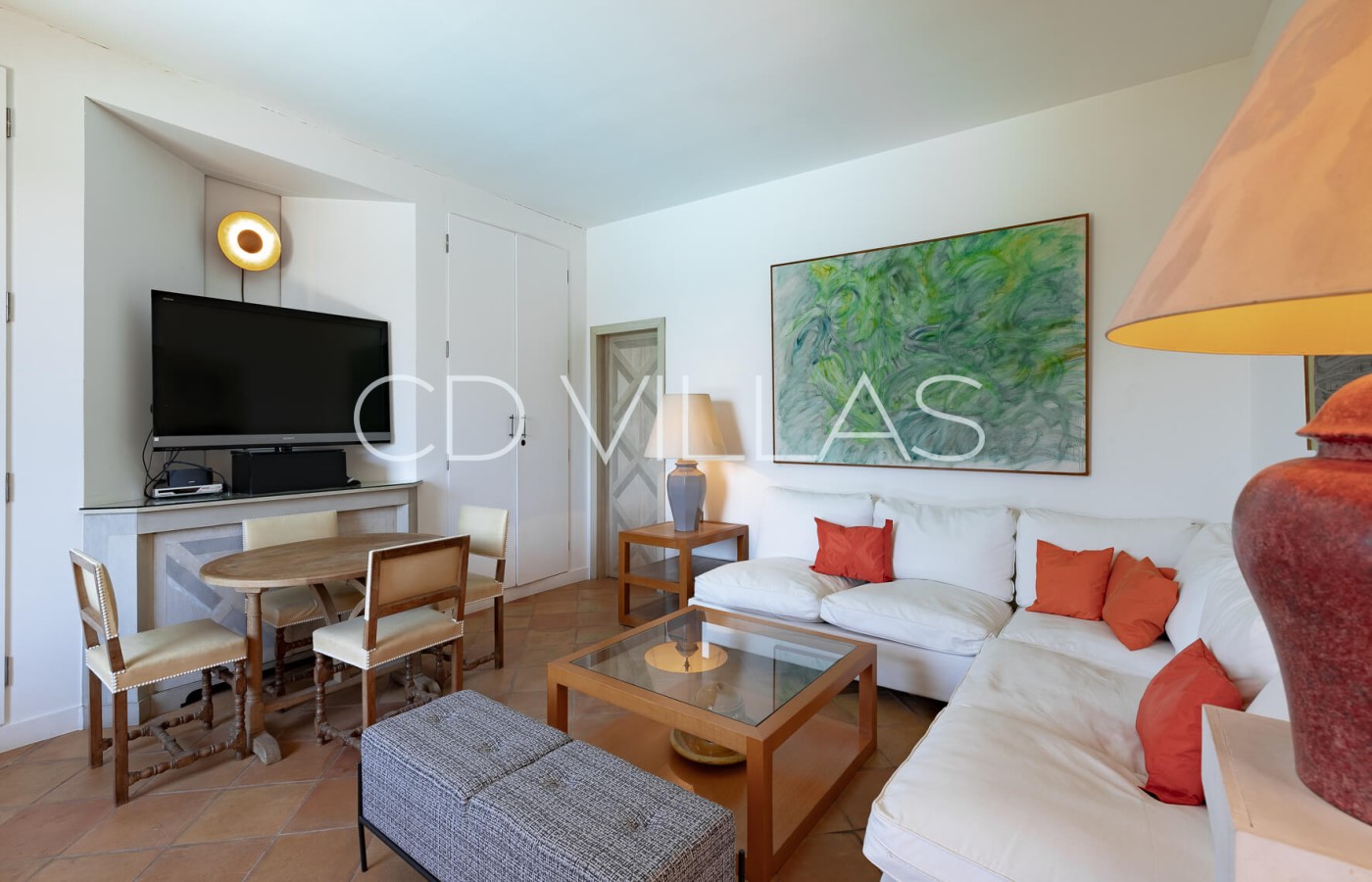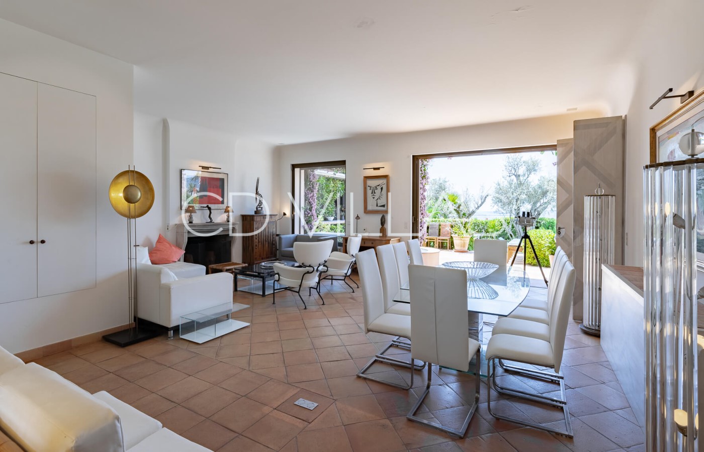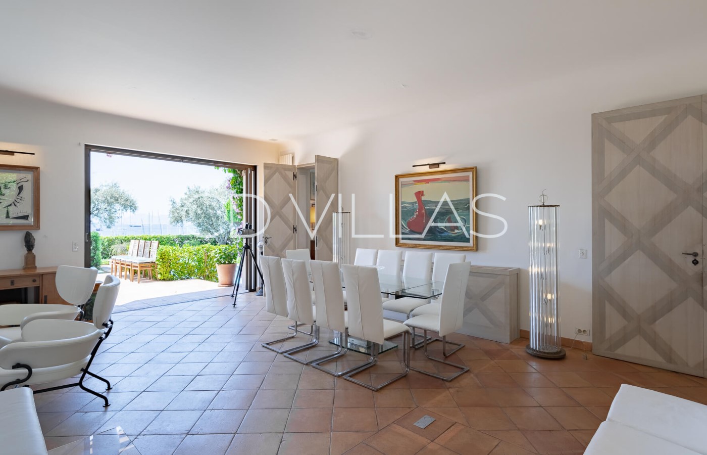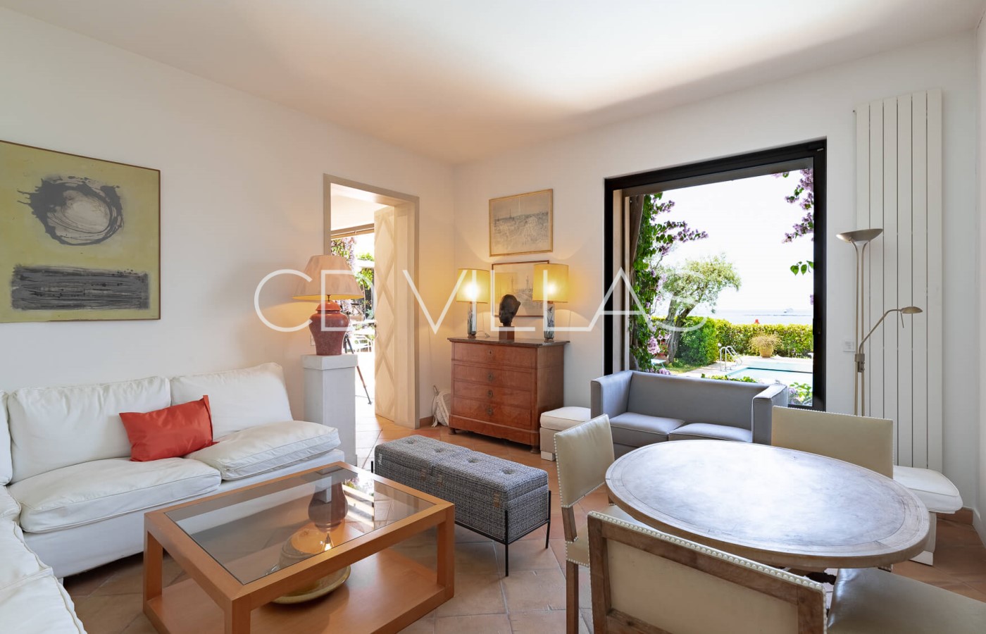 Living room - With comfortable seating, large sliding doors opening to the garden, pool, and sea view.