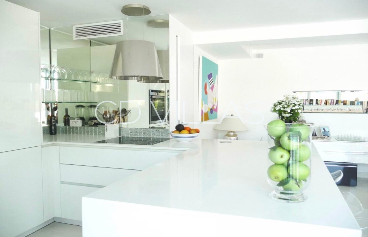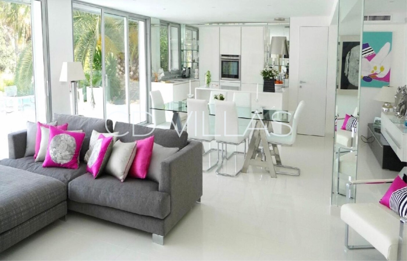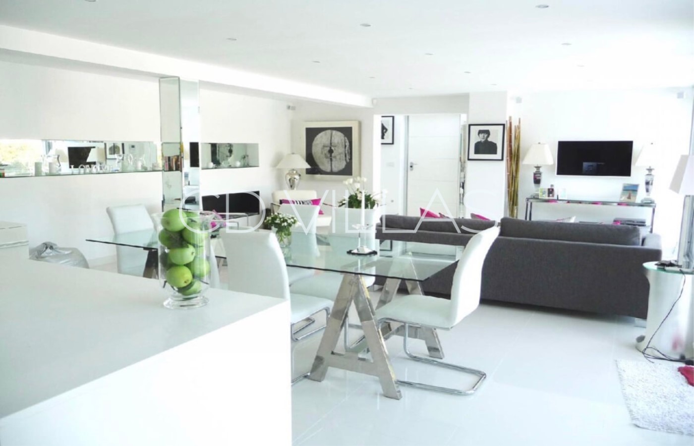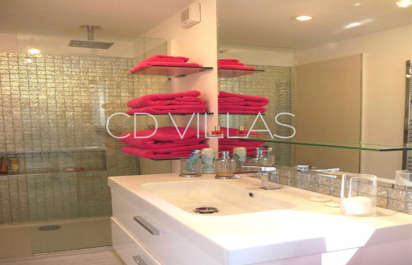 On the ground floor, you will find the living room with fireplace and dining room opening onto the pool as well as a fully equipped open kitchen with an access to both terrace and pool. Then, on the upper floor can be found the 3 ensuite bedrooms which all have TV. the first bedroom has access to a small terrace and full en suite bathroom. Bedroom 2 has access to a large terrace wtih stunning sea views and en suite showerroom. The final bedroom is equipped with large walk in dressing and en suite shower room. Guests have easy access to the utility room across the hall with washer and dryer.