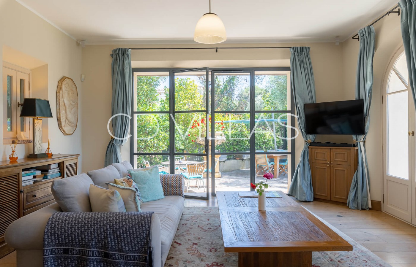The entrance opens onto the open living / dining with sumptous furnishings and large window doors opening onto terraces with view over garden and pool.