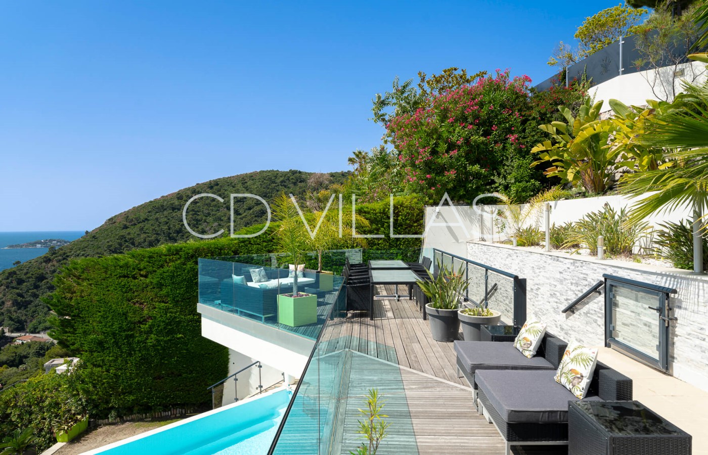 A beautiful mix of tropical and mediterranean gardens on different levels surround the villa with boules court, heated infinity swimming pool, pool house with kitchen and BBQ.