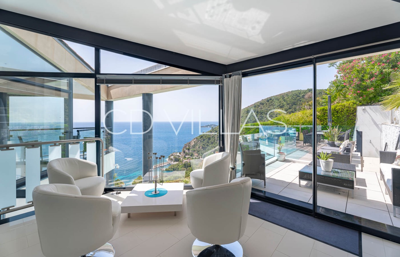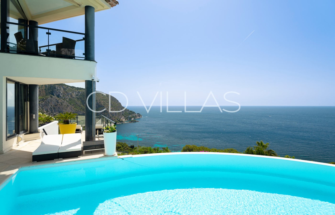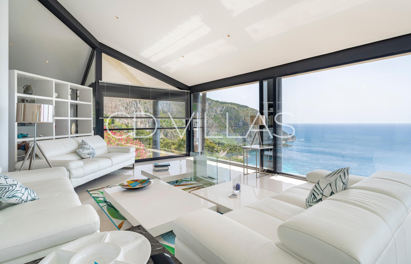 This stunning modern villa of 390m2 overlooks the bay of Eze bord de mer. The entrance hall, spacious living and dining rooms with glass floor to ceiling walls ensure that you don't miss the subtle changes in light or the display of fabulous yachts that come to visit the bay. There is also a TV/office area and cloakroom with WC. The high spec fully-equipped kitchen is located on the same level and has doors out to the upper tropical garden terrace with plenty of room for al fresco meals throughout the day.