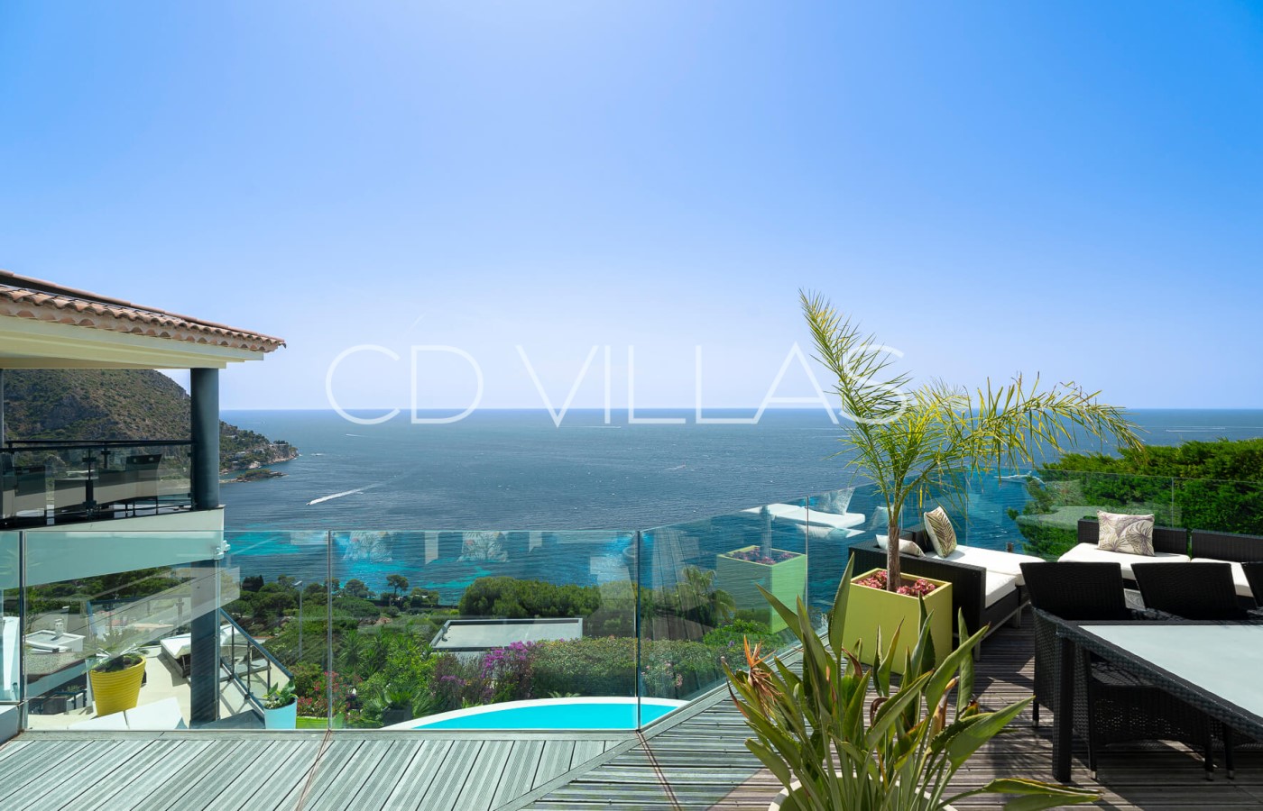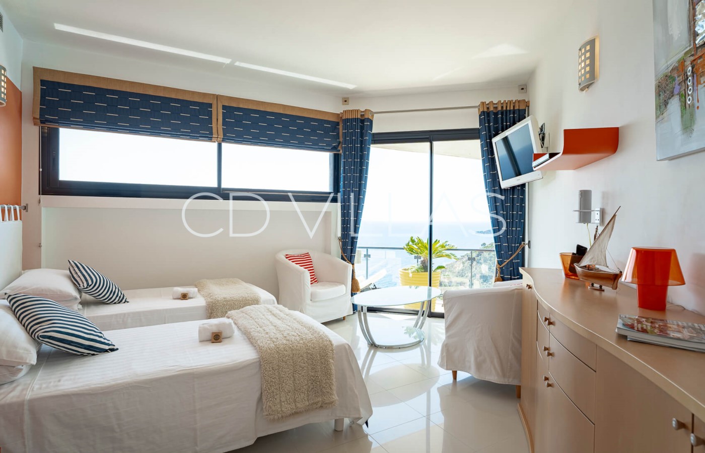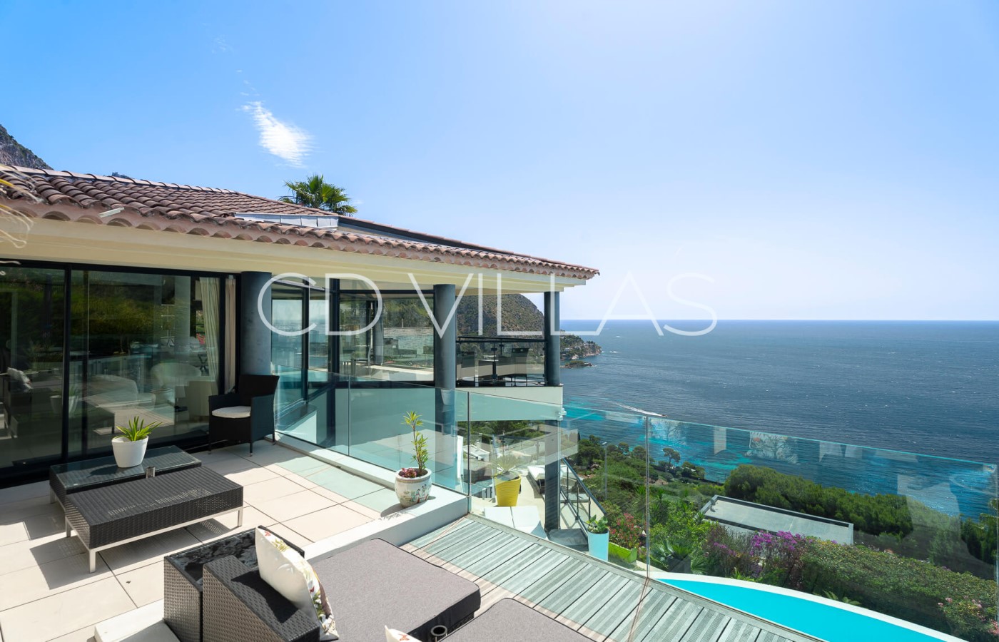 This stunning modern villa of 390m2 overlooks the bay of Eze bord de mer. The entrance hall, spacious living and dining rooms with glass floor to ceiling walls ensure that you don't miss the subtle changes in light or the display of fabulous yachts that come to visit the bay. There is also a TV/office area and cloakroom with WC. The high spec fully-equipped kitchen is located on the same level and has doors out to the upper tropical garden terrace with plenty of room for al fresco meals throughout the day.