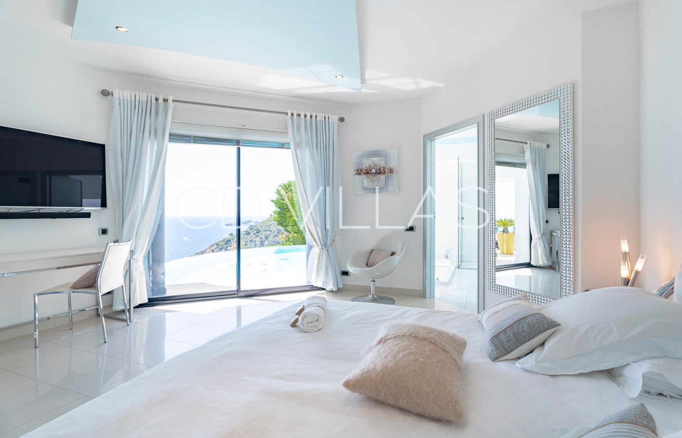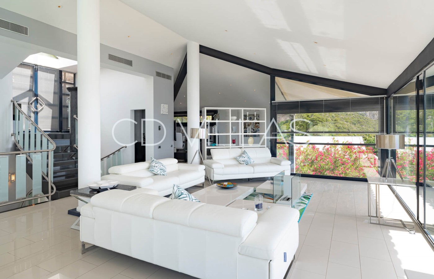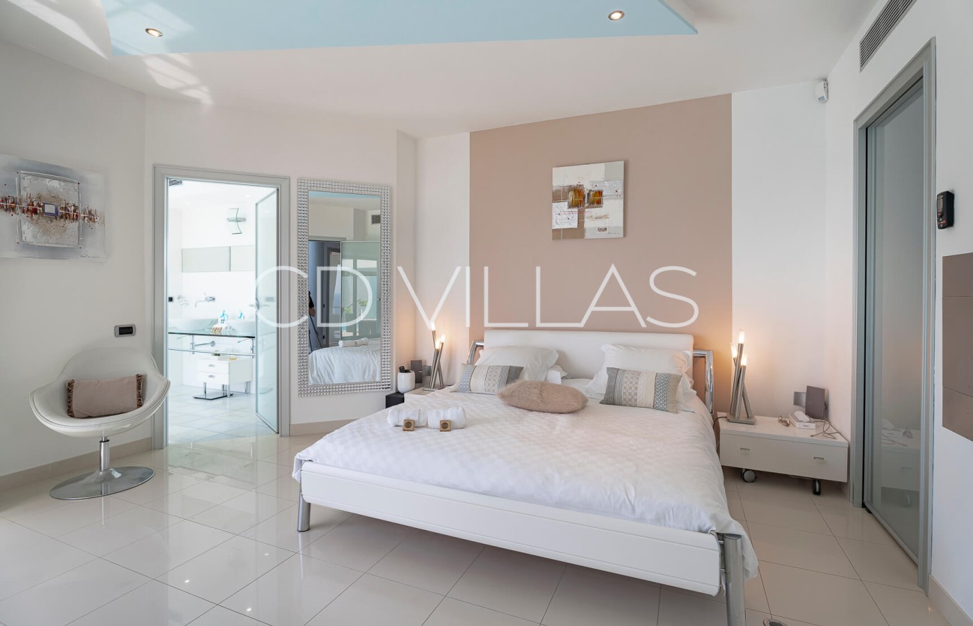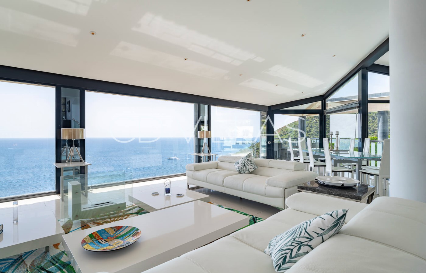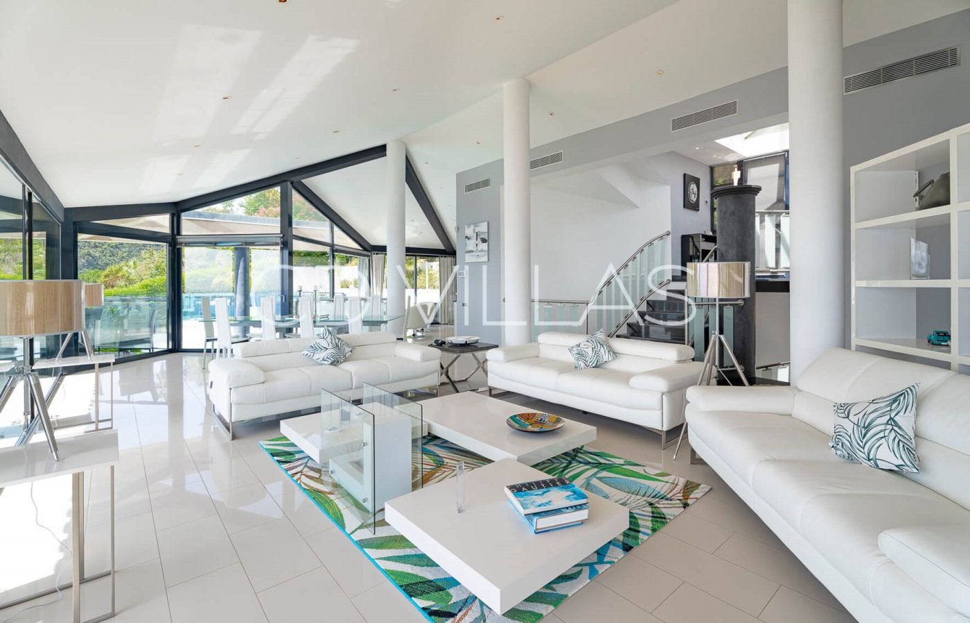 Living Room - Spacious living room with high quality, comfortable white leather sofas. Glassed walls on 3 sides allowing superb views of the mediterranean sea with its mesmerising changes in light in the morning and evening. The open-plan area leads into a quieter zone for watching TV, which includes SKY TV or a space to work - the villa is connected to Fibre for high speed access to WiFi. There is also a cloakroom.