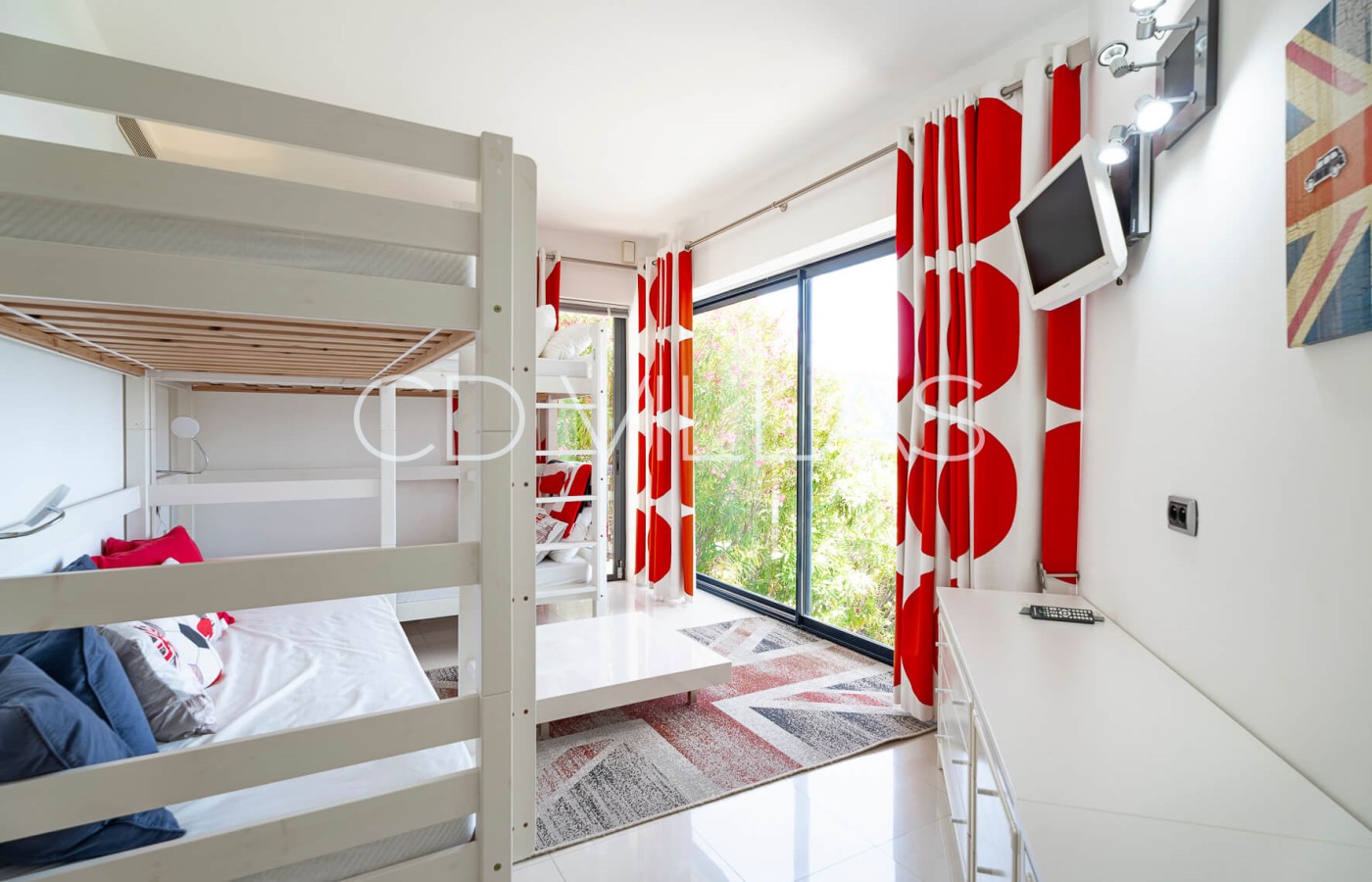Bedroom 4 - Light and fun bunk bed room - with 2 bunk beds, sleeps 4 children. Fitted cupboards, TV and airconditioning. Doors opening into the garden. ENSUITE : Shower room with basin and WC.