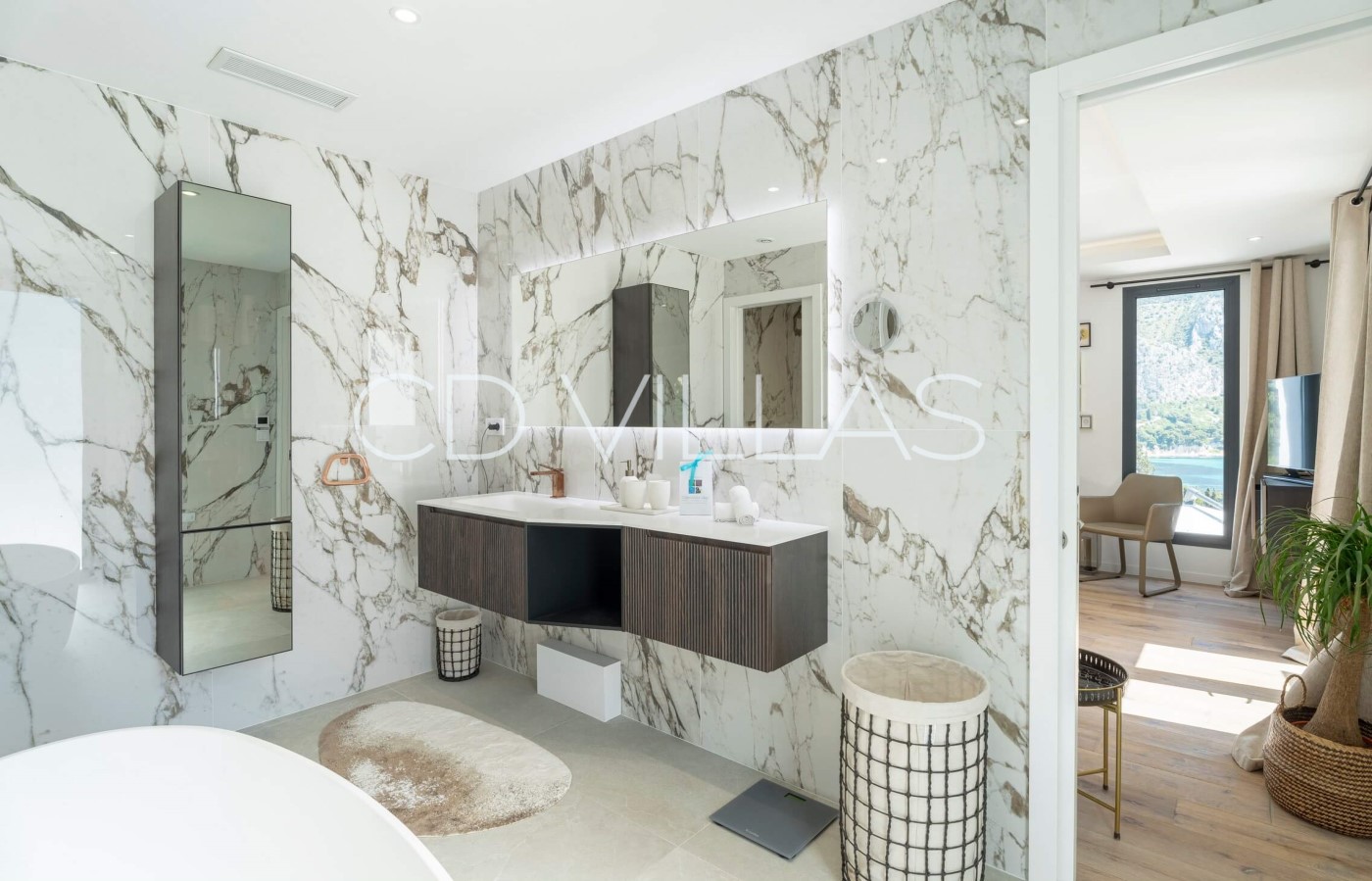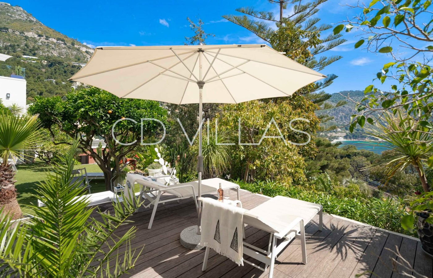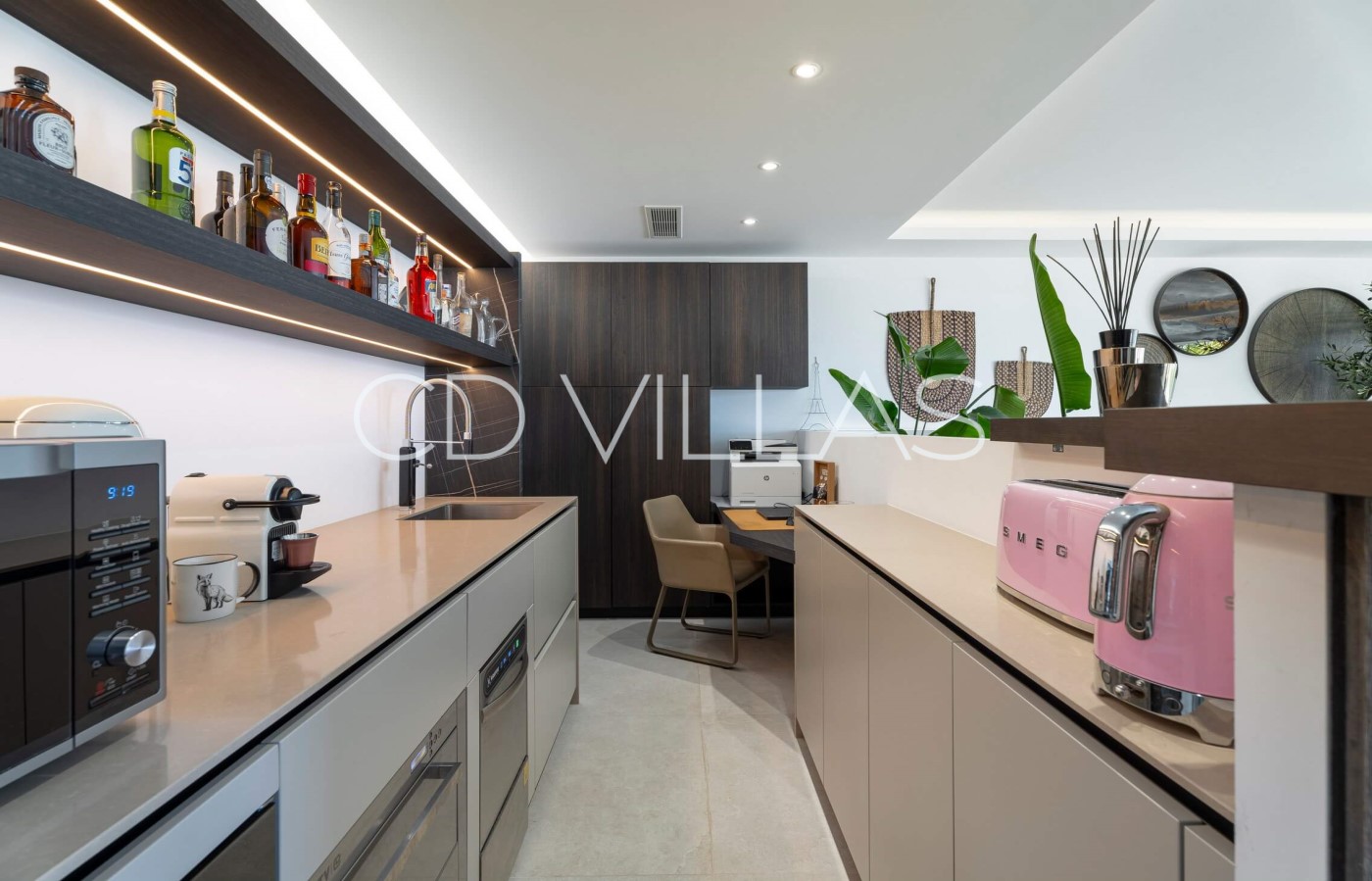 Perched above the shimmering Mediterranean, this designer luxury villa offers a seamless blend of contemporary elegance and relaxed coastal living. Floor-to-ceiling glass sliding doors frame breathtaking sea views and flood the open-plan living, dining, and kitchen area with natural light, creating a spectacular indoor-outdoor flow. Step directly onto the sun-drenched terrace where the infinity pool appears to melt into the horizon.