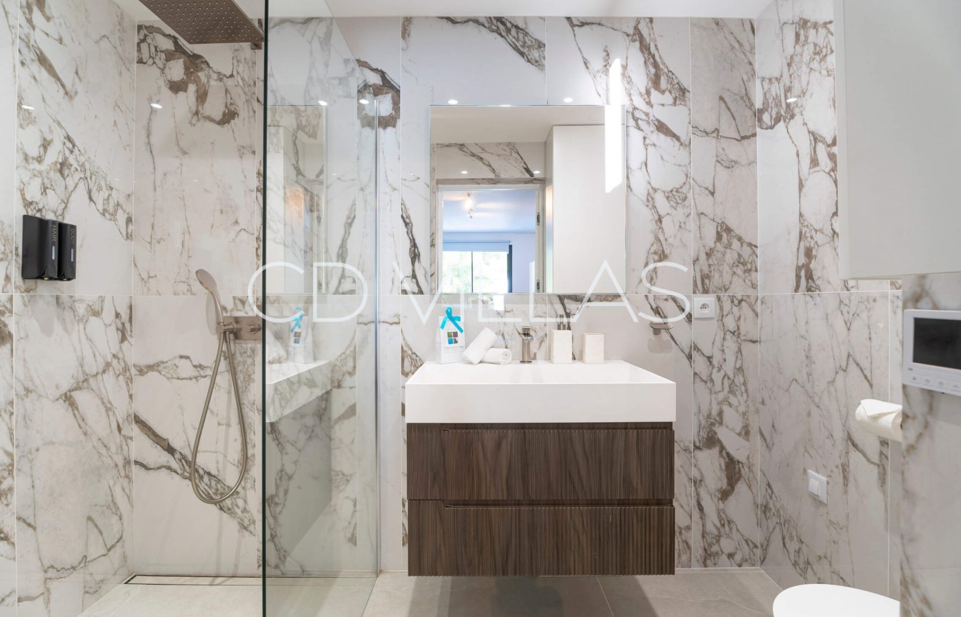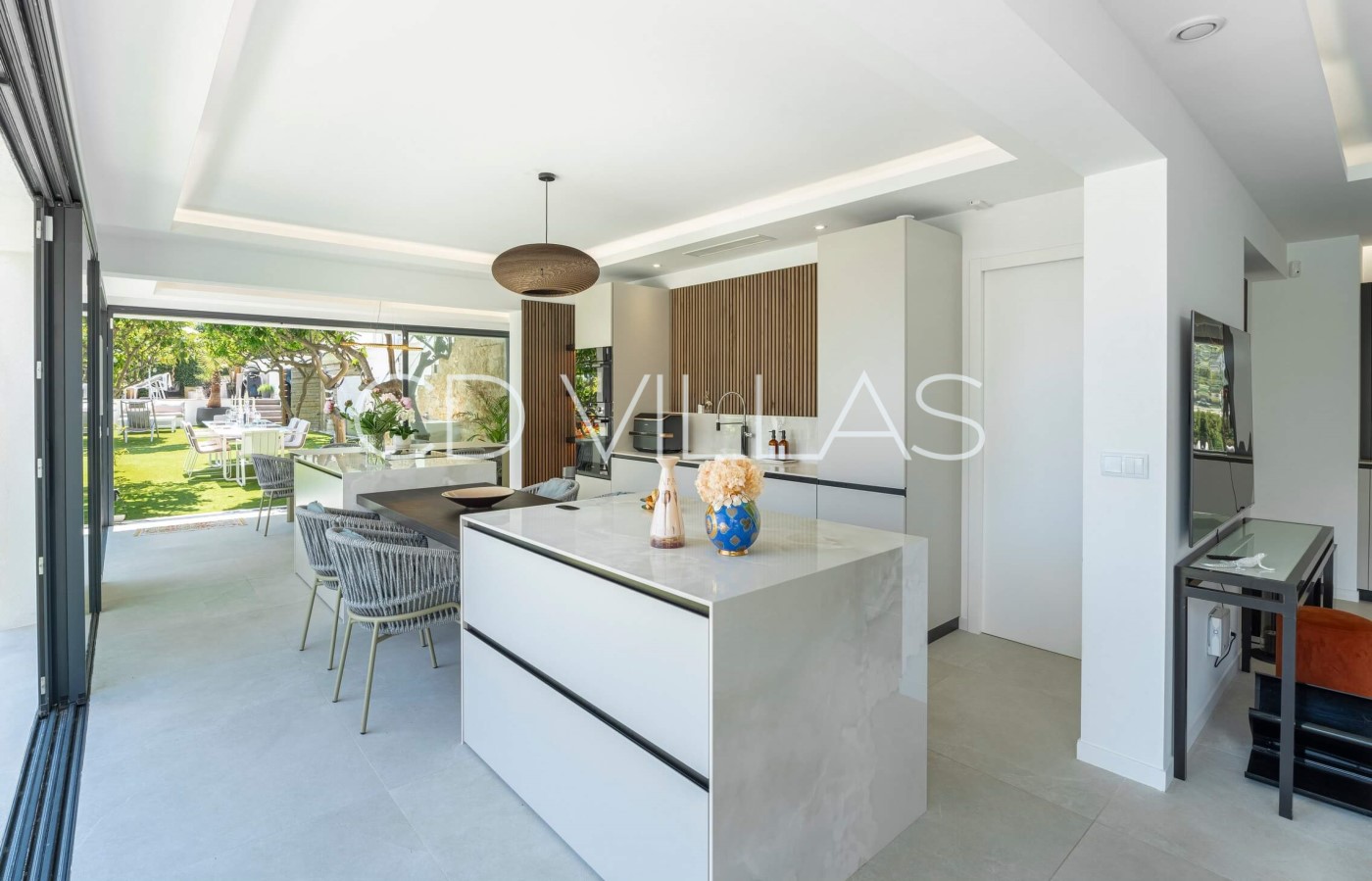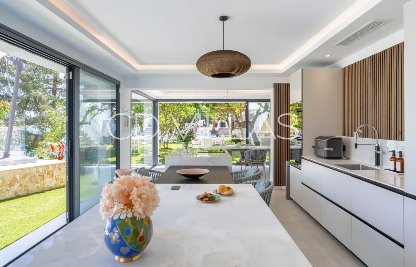 Perched above the shimmering Mediterranean, this designer luxury villa offers a seamless blend of contemporary elegance and relaxed coastal living. Floor-to-ceiling glass sliding doors frame breathtaking sea views and flood the open-plan living, dining, and kitchen area with natural light, creating a spectacular indoor-outdoor flow. Step directly onto the sun-drenched terrace where the infinity pool appears to melt into the horizon.