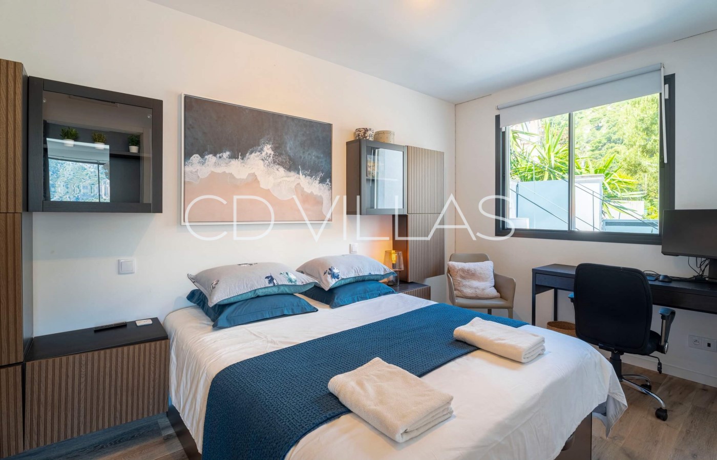 The main house features three bedrooms on the top floor, each with its own en suite bathroom, offering privacy and comfort for every guest. A fourth studio bedroom, accessed separately from the garden and pool area, provides equally high standards of design and comfort - ideal for guests seeking additional independence.