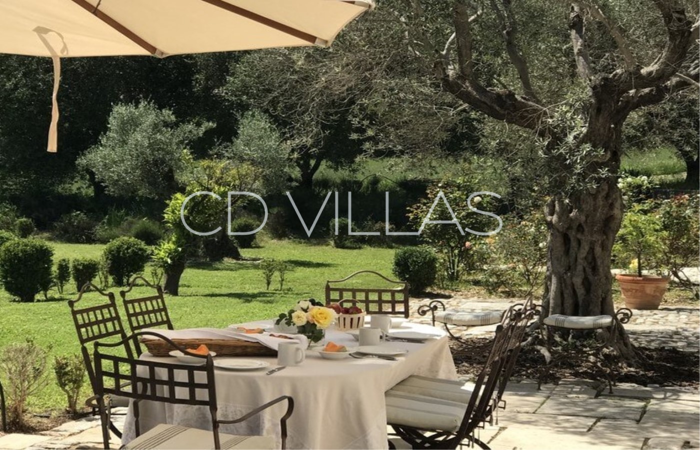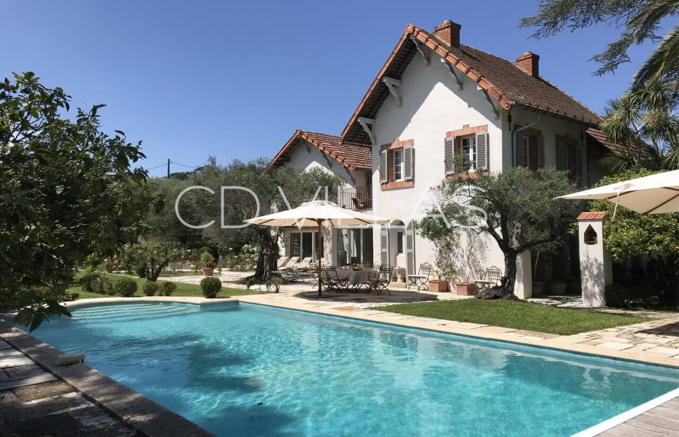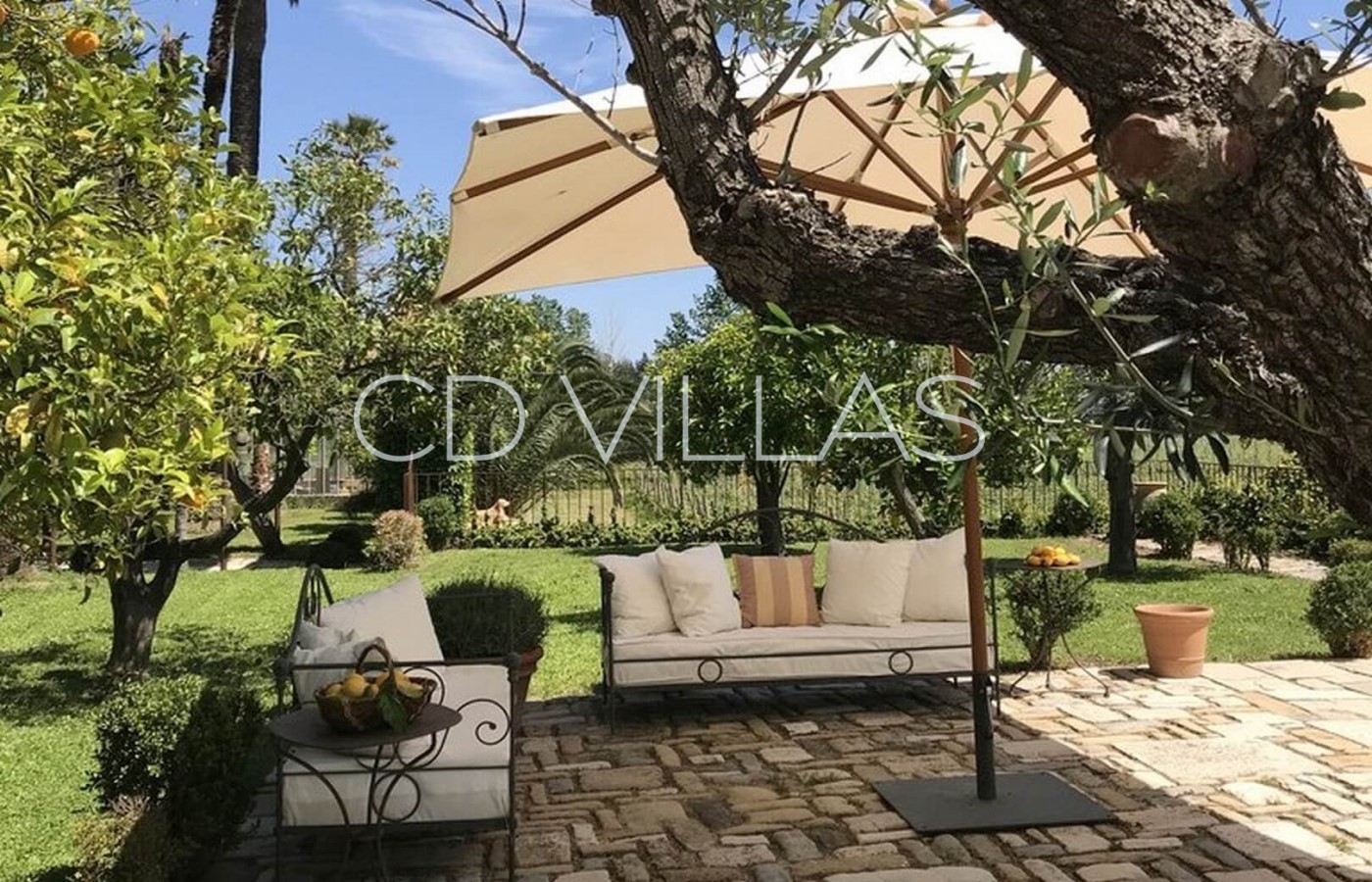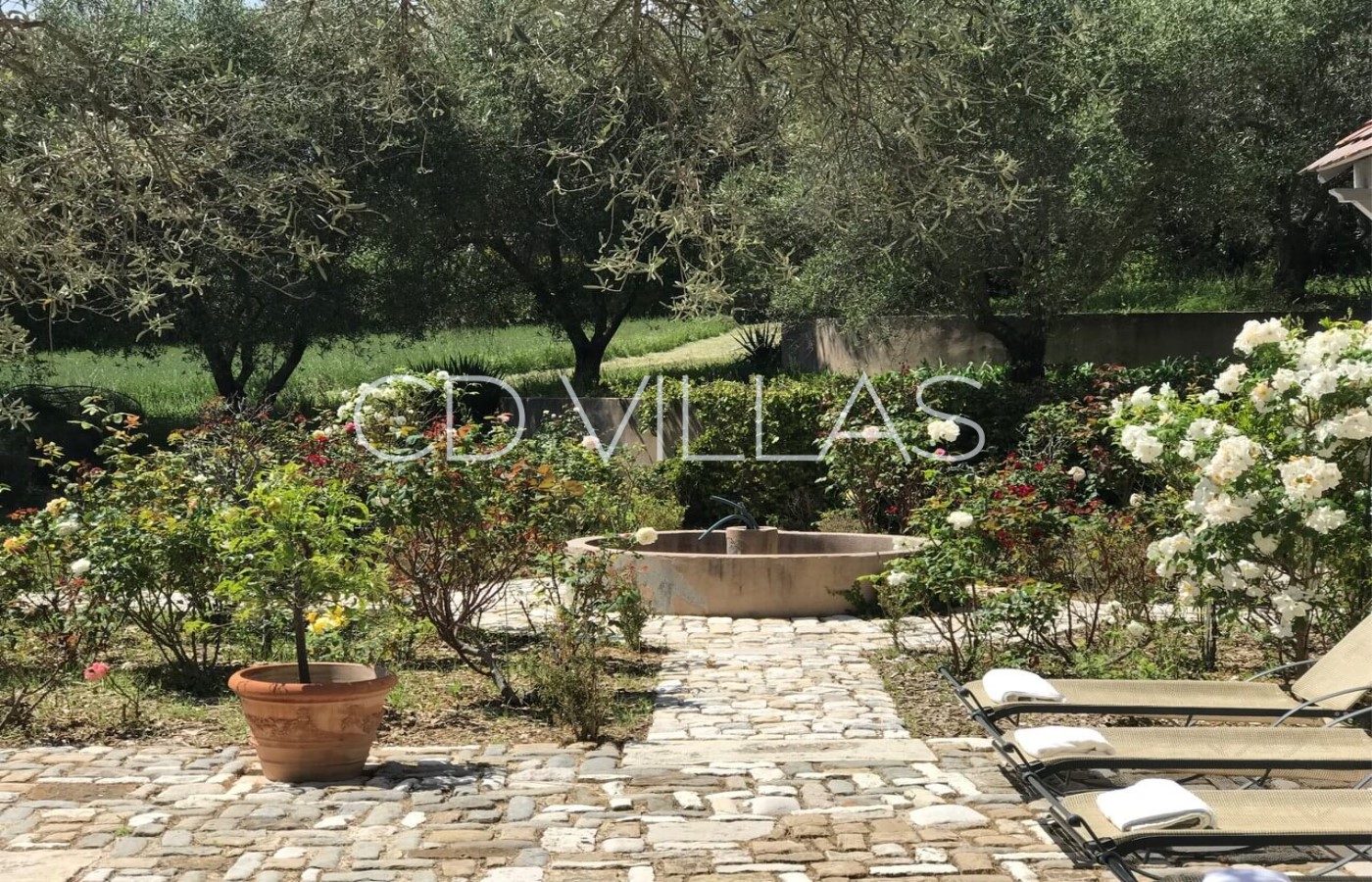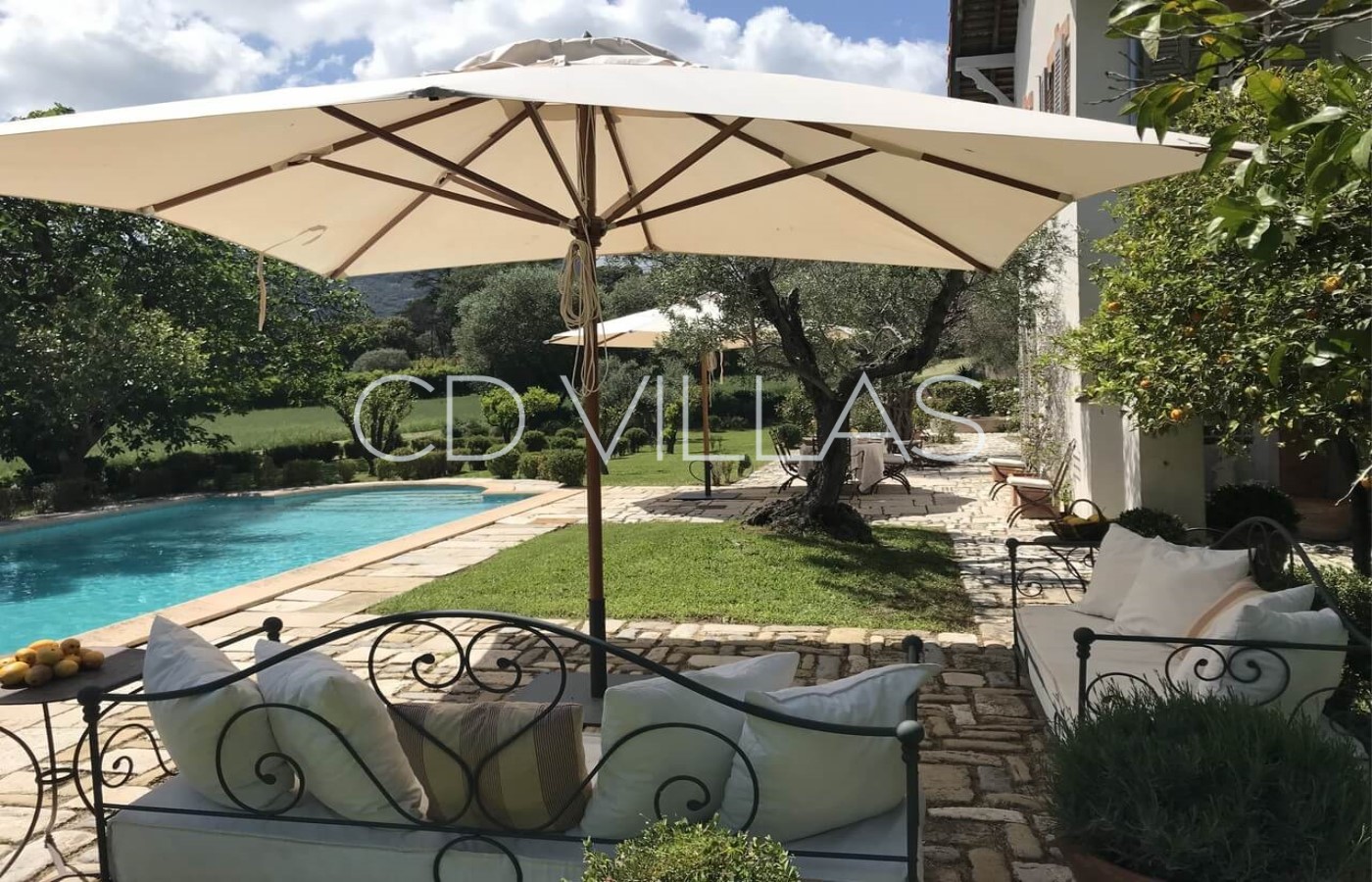 The villa sits on large grounds at the back of the vineyard with a flat lawn area, a long drive flanked by many cypresses and a charming garden with many mediterranean plants like lavenders, fig and olive trees, lemon, orange and mandarine trees and a beautiful rose garden.
