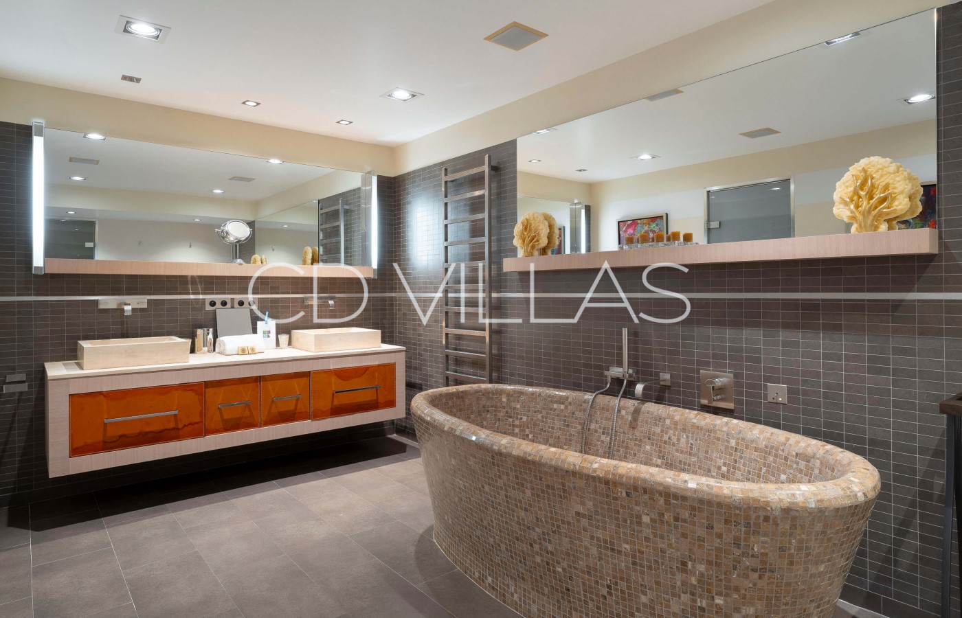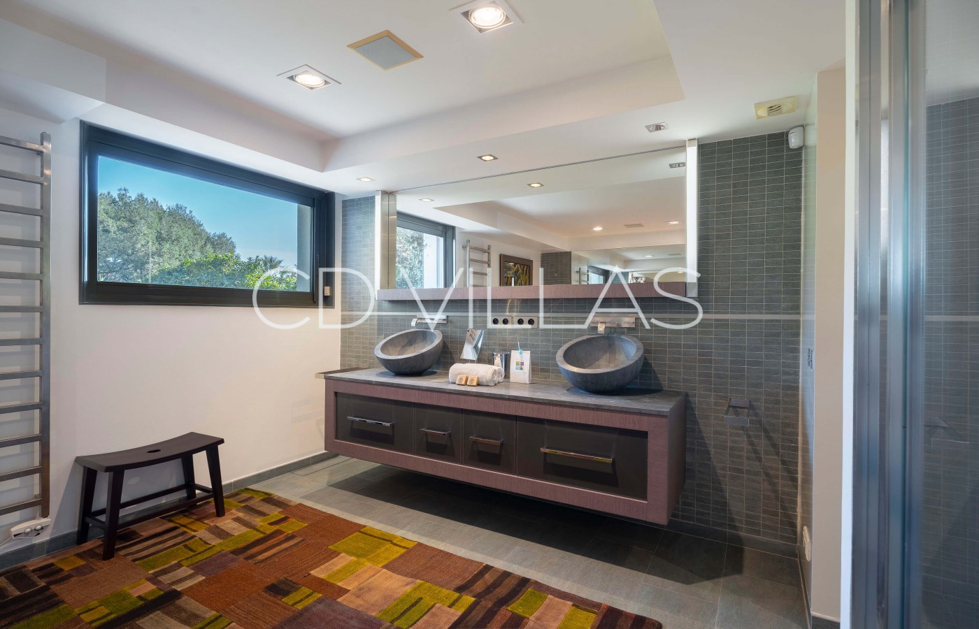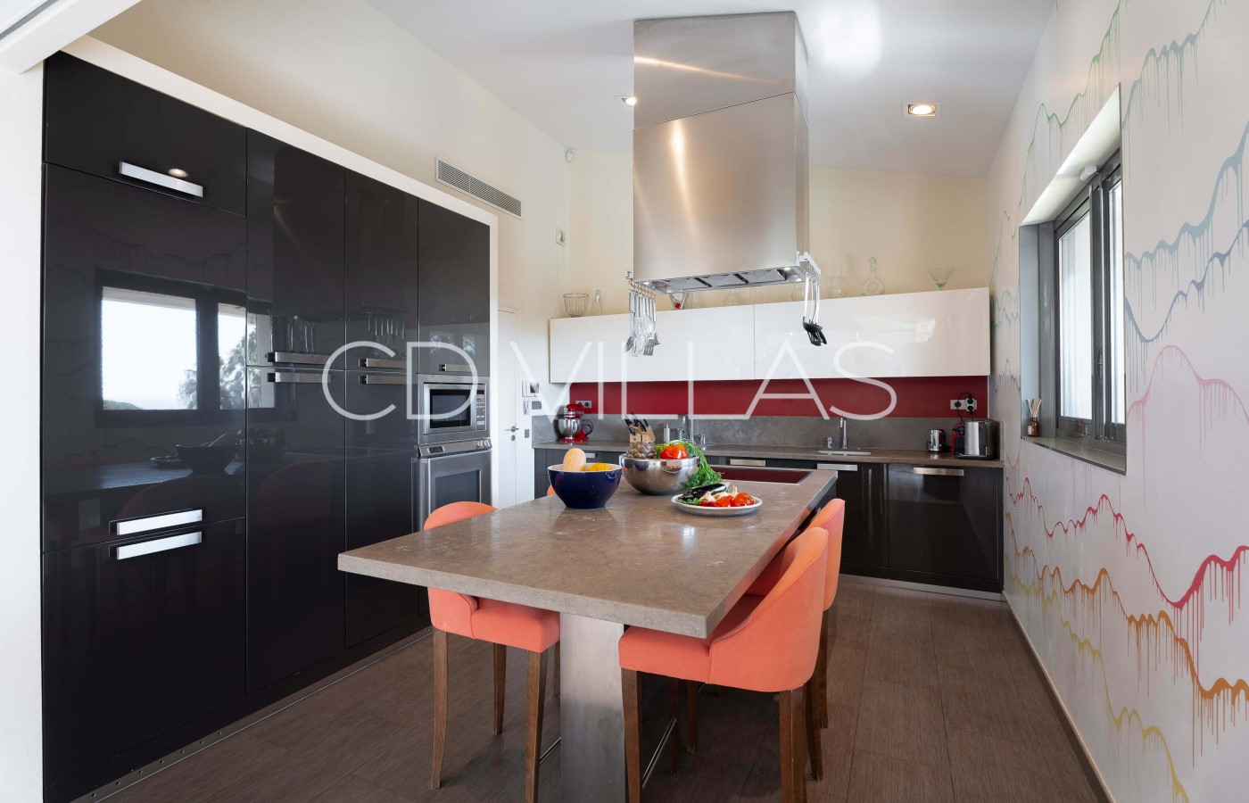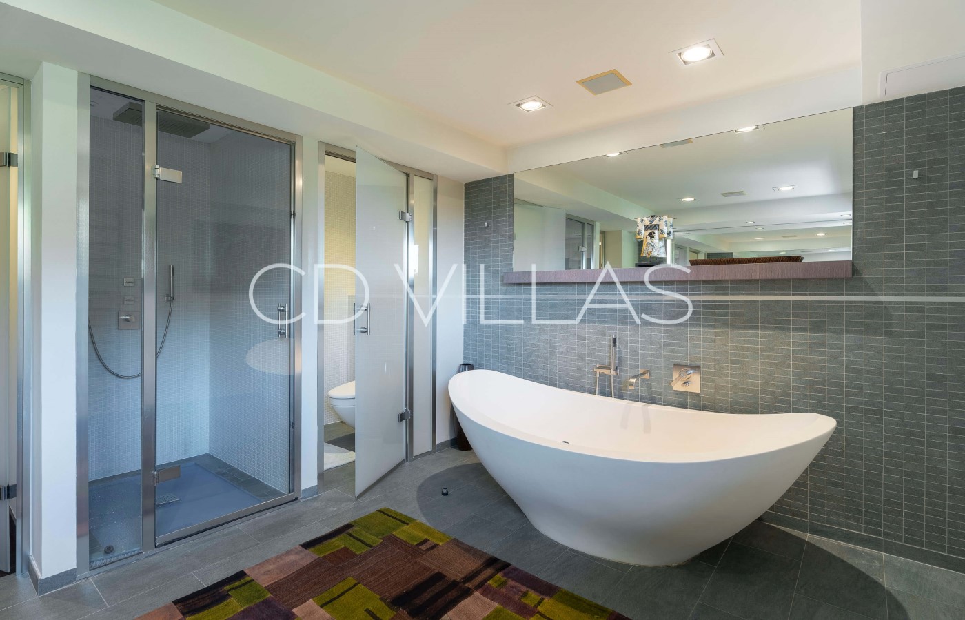 The ground floor offers a large open plan living room/dining room which has been nicely furnished with high quality furniture, an open fireplace and a large flat screen TV. A large sun terrace overlooking the swimming pool can be accessed directly from the living room where guests can enjoy beautiful sea views. Leading directly from the living room is a fully equipped contemporary kitchen. Also on the ground floor is a large master bedroom with a luxurious ensuite bathroom with top quality bathroom fittings.